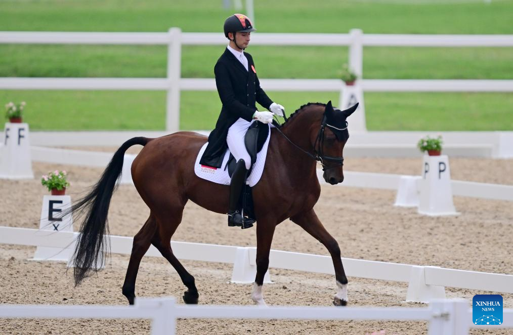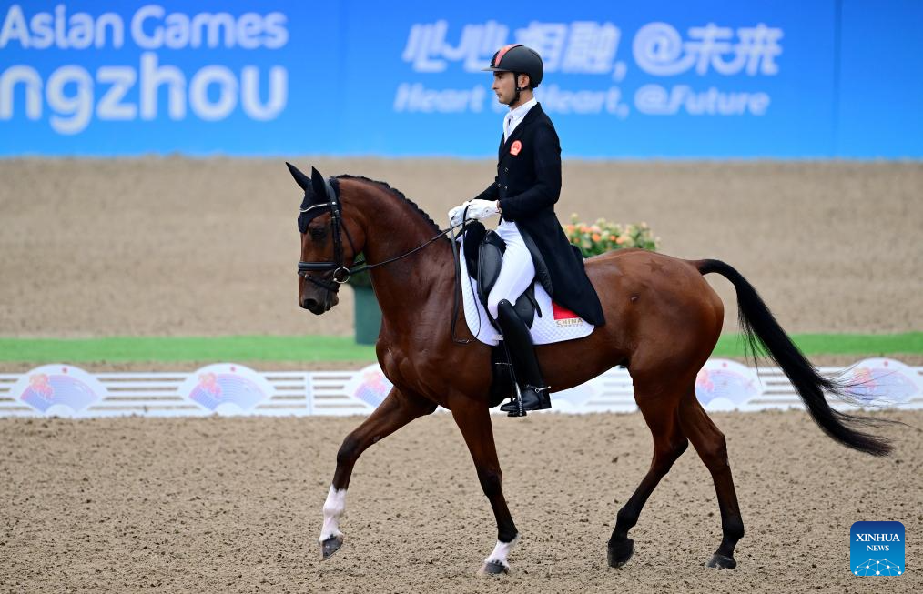 Hua Tian of China competes during the Eventing Dressage Team and Individual of Equestrian at the 19th Asian Games in Hangzhou, east China's Zhejiang Province, Sept. 30, 2023. (Xinhua/Wei Peiquan)