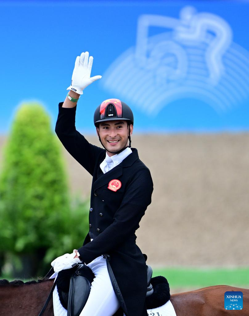 Hua Tian of China waves to spectators after the Eventing Dressage Team and Individual of Equestrian at the 19th Asian Games in Hangzhou, east China's Zhejiang Province, Sept. 30, 2023. (Xinhua/Wei Peiquan)