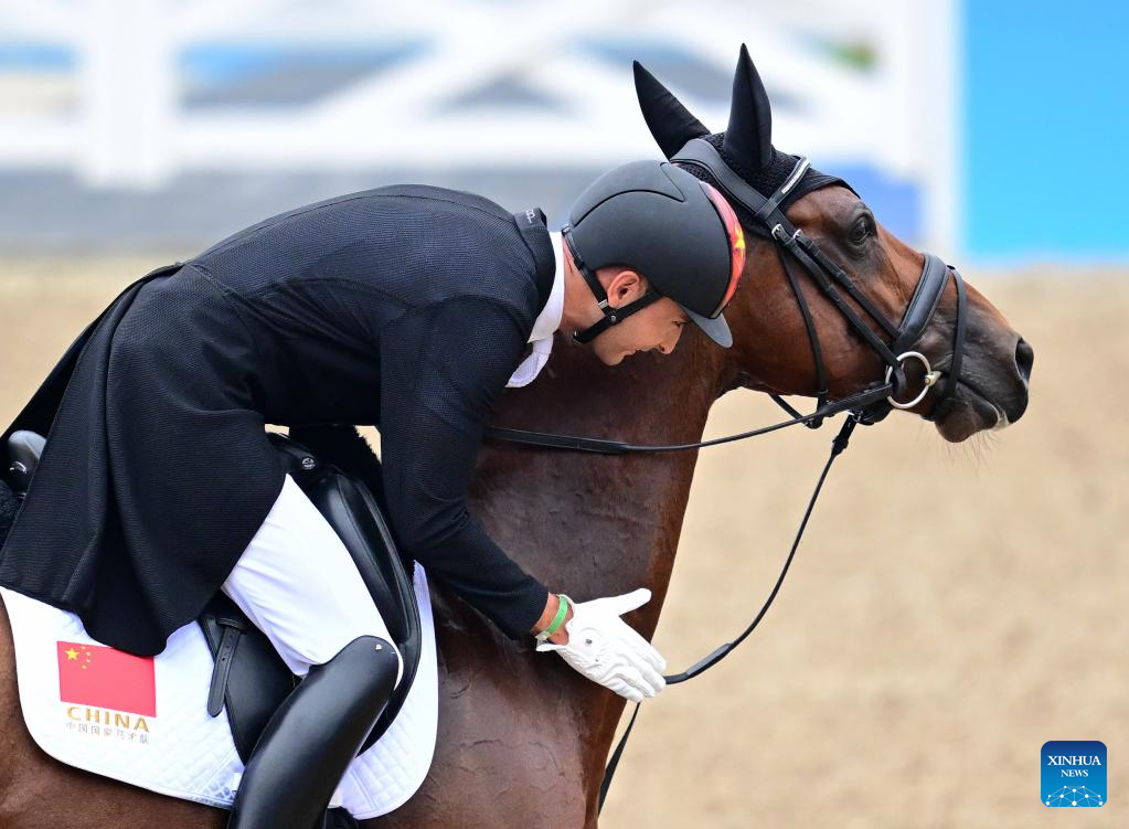 Hua Tian of China pats his horse after the Eventing Dressage Team and Individual of Equestrian at the 19th Asian Games in Hangzhou, east China's Zhejiang Province, Sept. 30, 2023. (Xinhua/Wei Peiquan)