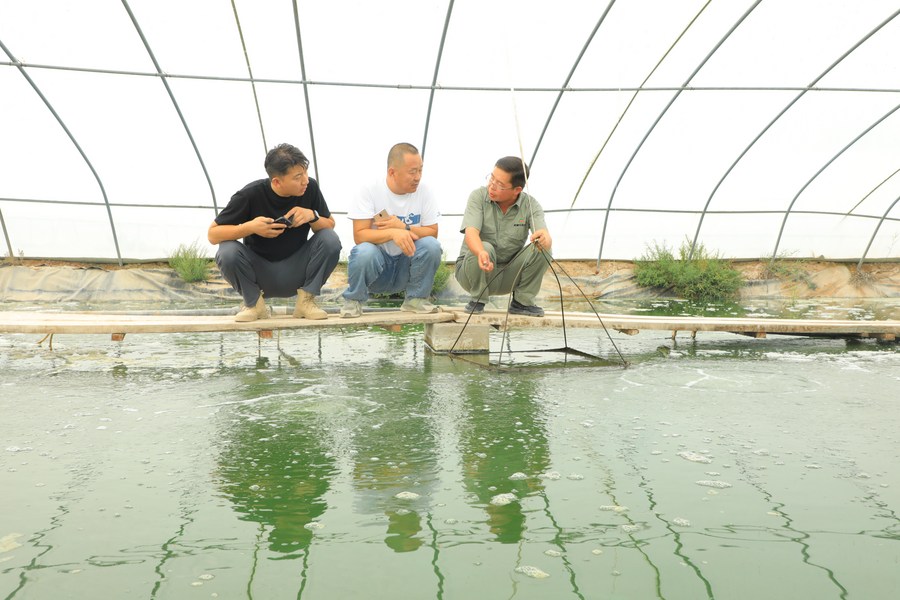 Jiang Shengguo (1st R) communicates with breeders on the breeding techniques of the Pacific white shrimps at a breeding base in Wuqia, a township of Kuqa City in northwest China's Xinjiang Uygur Autonomous Region, Sept. 5, 2023. (Photo by Liu Xuemei/Xinhua)