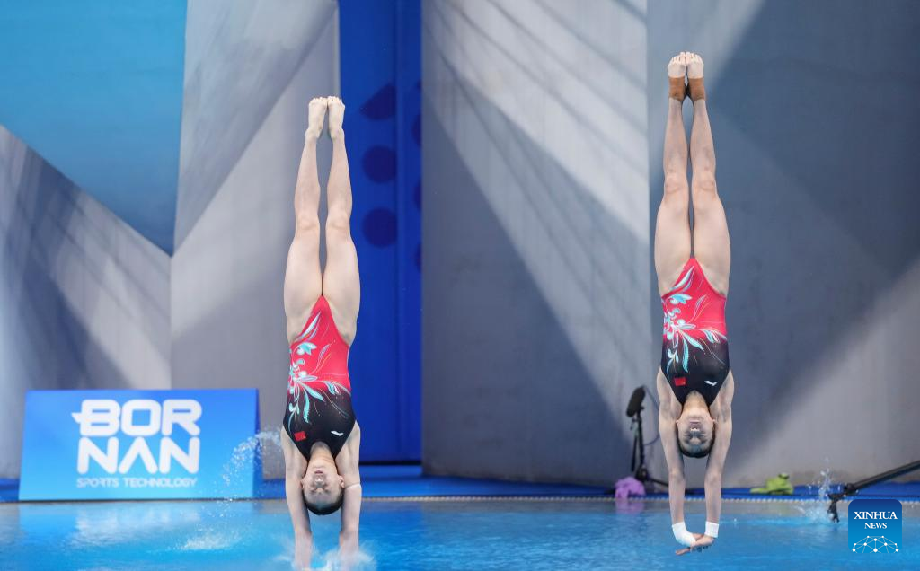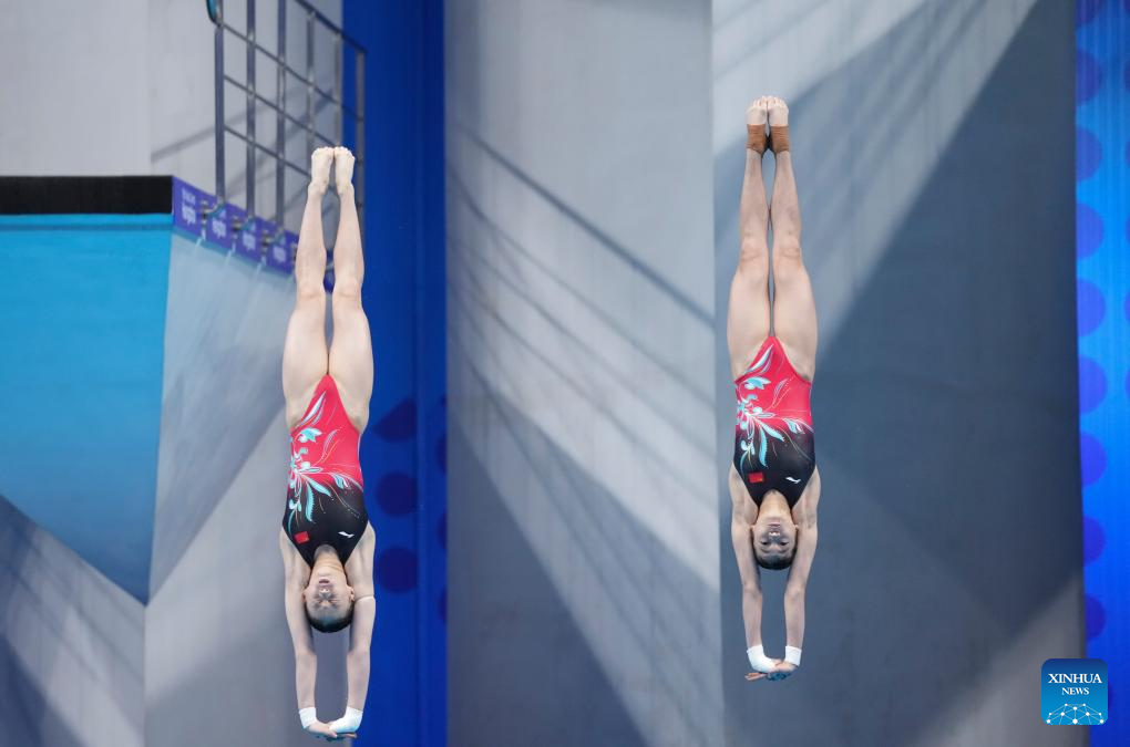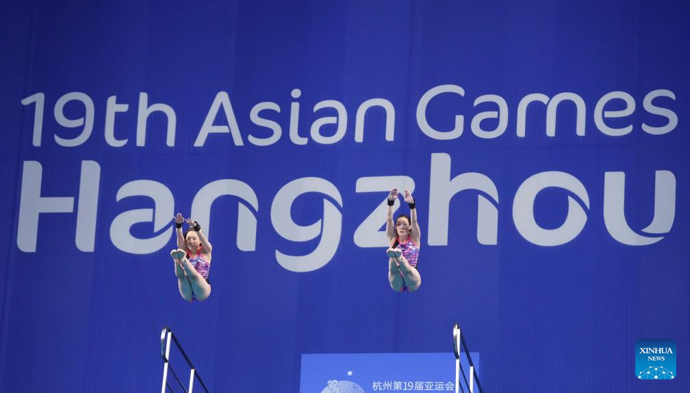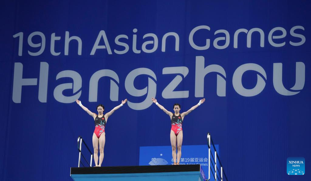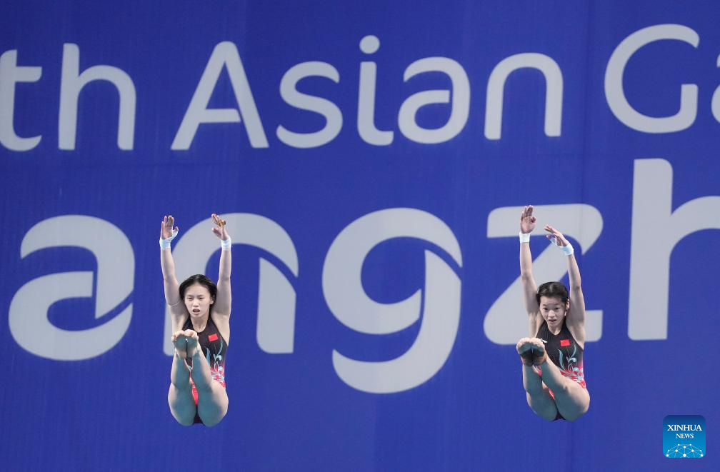Quan Hongchan (R)/Chen Yuxi of China compete during the Women's Synchronised 10m Platform Final of Diving at the 19th Asian Games in Hangzhou, east China's Zhejiang Province, Sept. 30, 2023. (Xinhua/Du yu)