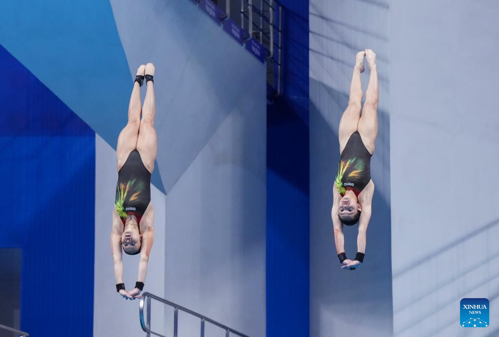 Arai Matsuri (L)/Itahashi Minami of Japan compete during the Women's Synchronised 10m Platform Final of Diving at the 19th Asian Games in Hangzhou, east China's Zhejiang Province, Sept. 30, 2023. (Xinhua/Du yu)