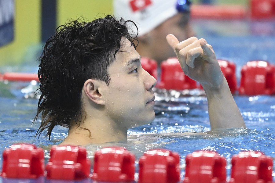 Qin Haiyang reacts after the men's 200m breaststroke final at the Hangzhou Asian Games on Sept. 28, 2023. (Xinhua/Huang Zongzhi)