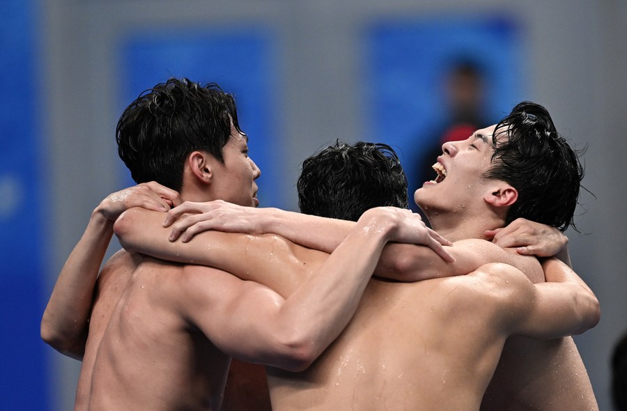 South Korea celebrate after the men's 4x200m freestyle relay final at the Hangzhou Asian Games on Sept. 25, 2023. (Xinhua/Xia Yifang)