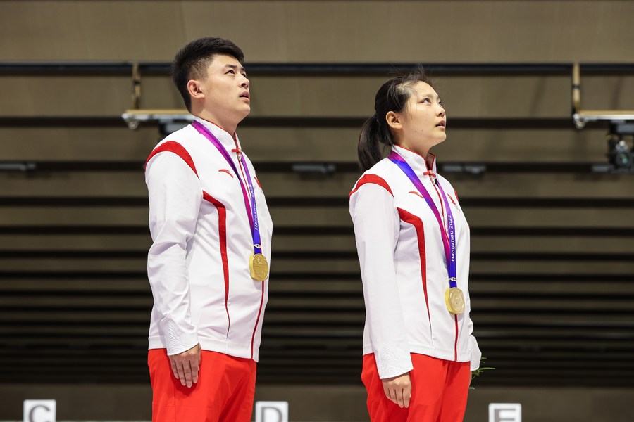 HANGZHOU, Sept. 30 (Xinhua) -- China's Jiang Ranxin and Zhang Bowen edged their Indian rivals in the 10m air pistol mixed team event of the Hangzhou Asian Games to win the gold on Saturday.
