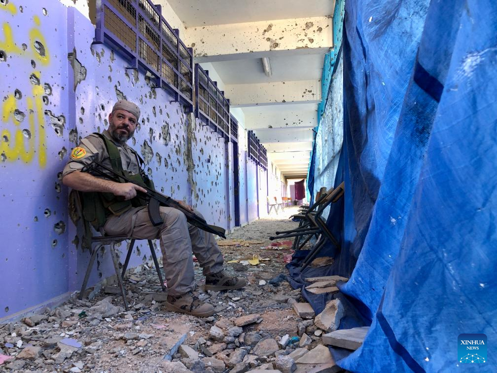 This photo taken with a mobile phone shows a member of a joint Palestinian security force in a UN refugee school at Ain Al-Helweh camp, in southern Lebanon, on Sept. 29, 2023. Armed militants withdrew on Friday from the eight schools of the United Nations Relief and Works Agency for Palestine Refugees (UNRWA) at Ain Al-Helweh camp in southern Lebanon, the National News Agency (NNA) reported.
