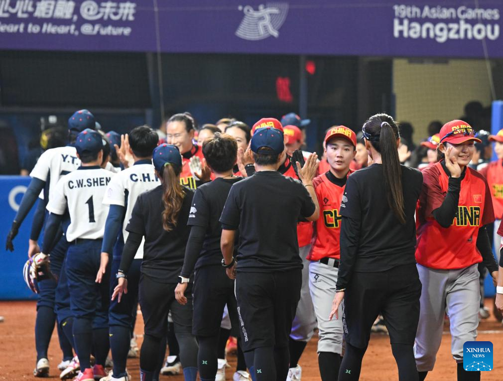 Athletes greet each other after Super Round 2 of Softball Women between China and Chinese Taipei at the 19th Asian Games in Shaoxing, east China's Zhejiang Province, Sept. 29, 2023. (Xinhua/Yang Guanyu)