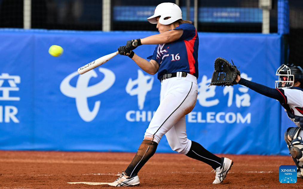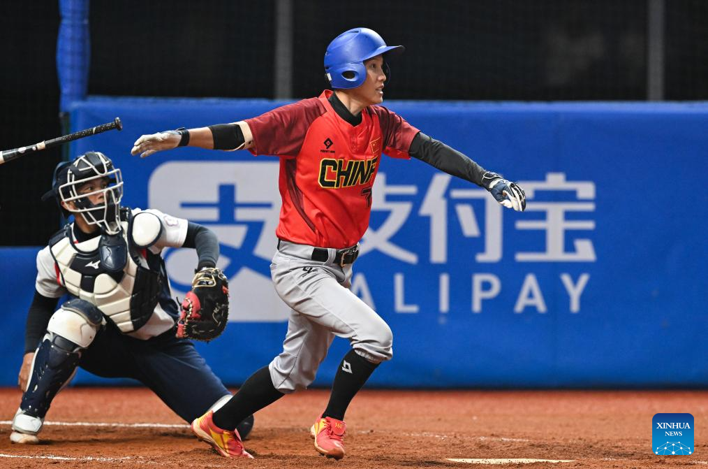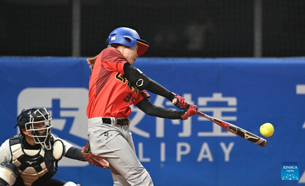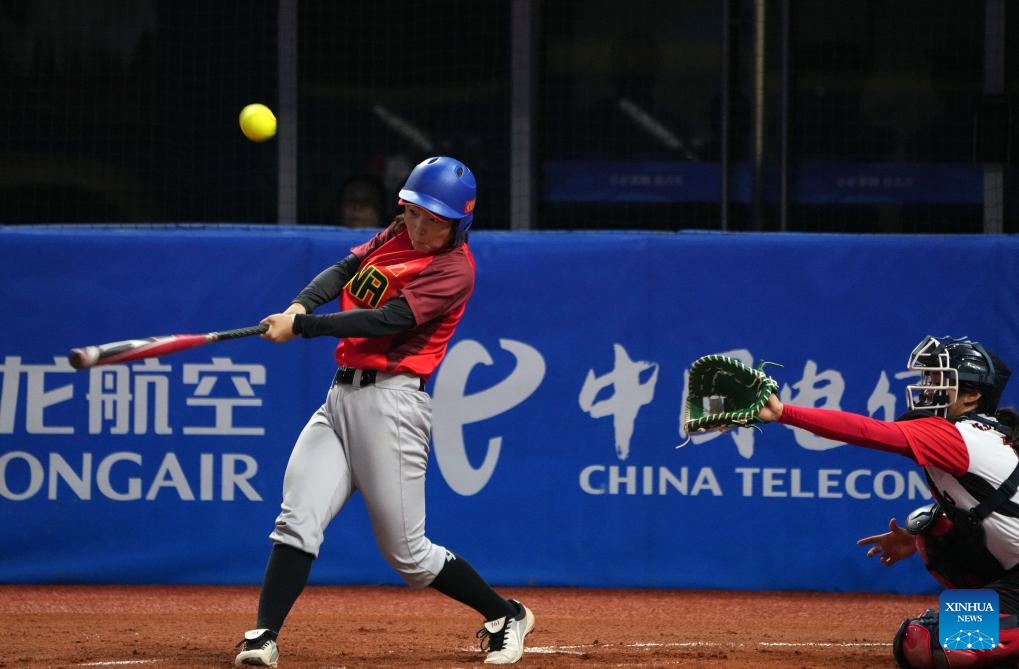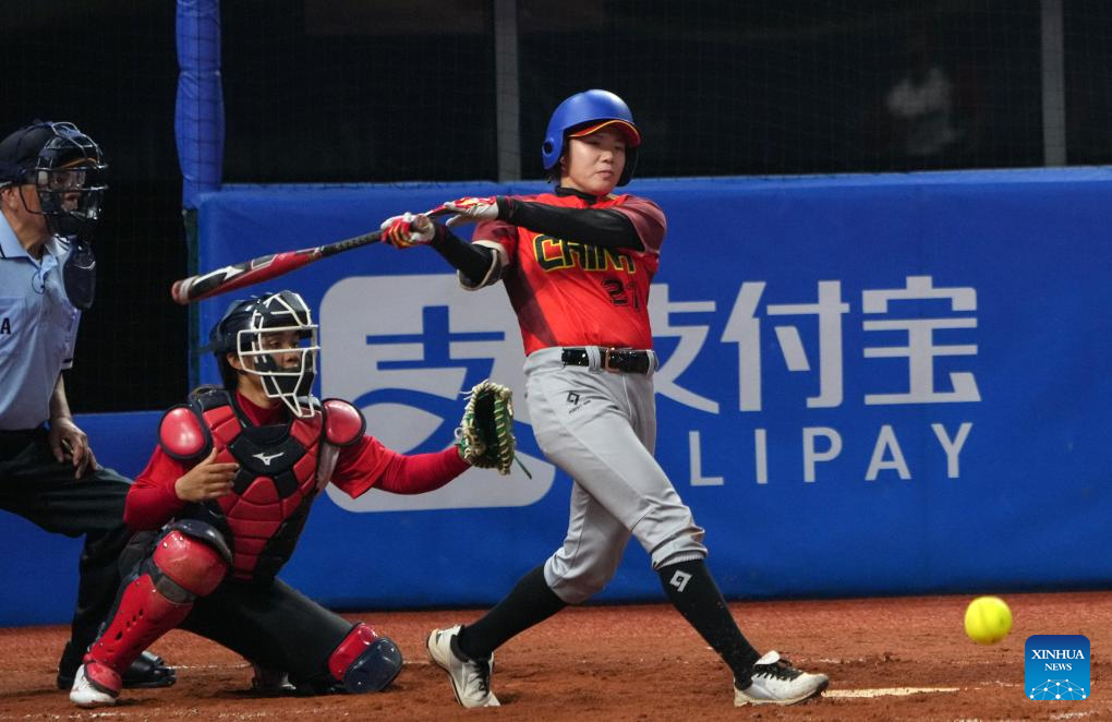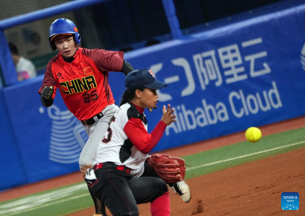 Xie Jiaxin of China competes during Super Round 2 of Softball Women between China and Chinese Taipei at the 19th Asian Games in Shaoxing, east China's Zhejiang Province, Sept. 29, 2023. (Xinhua/Yang Guanyu)