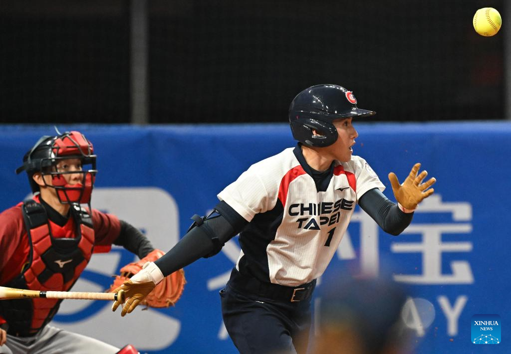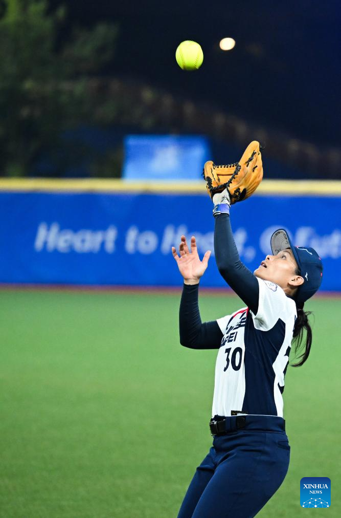 Shen Chia Wen of Chinese Taipei competes during Super Round 2 of Softball Women between China and Chinese Taipei at the 19th Asian Games in Shaoxing, east China's Zhejiang Province, Sept. 29, 2023. (Xinhua/Yang Guanyu)