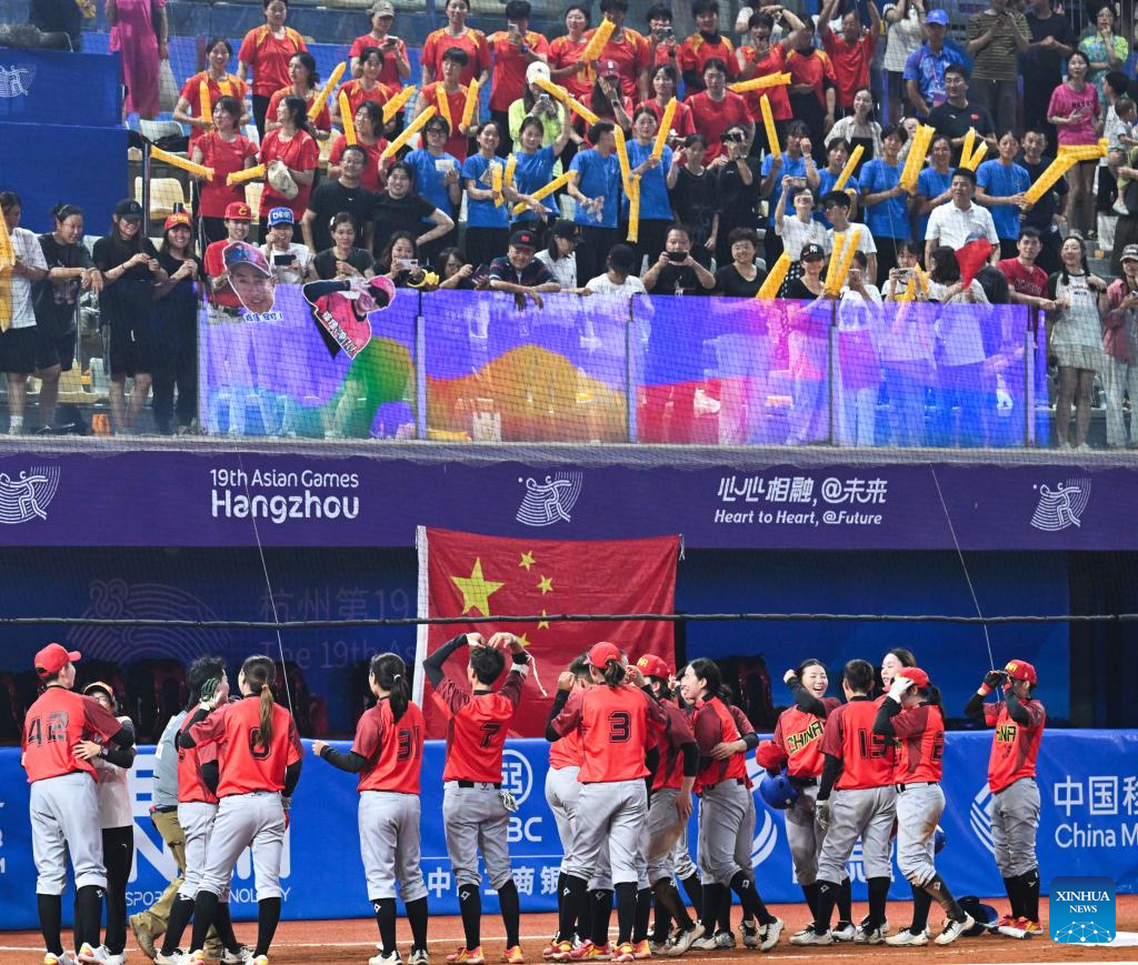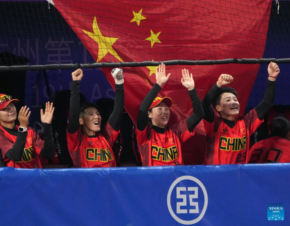 Athletes of China react after Super Round 2 of Softball Women between China and Chinese Taipei at the 19th Asian Games in Shaoxing, east China's Zhejiang Province, Sept. 29, 2023. (Xinhua/Yang Guanyu)