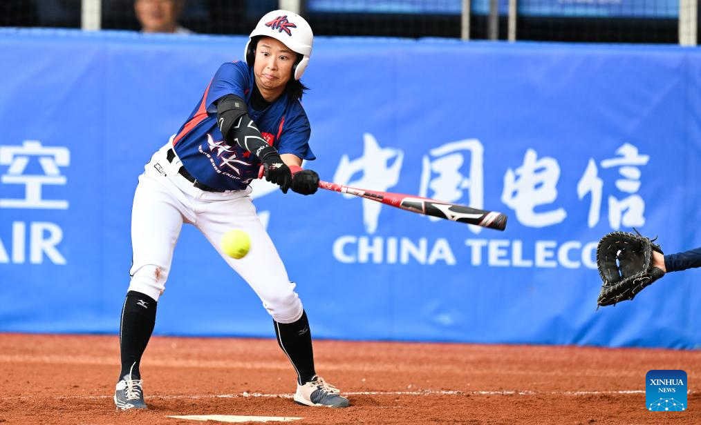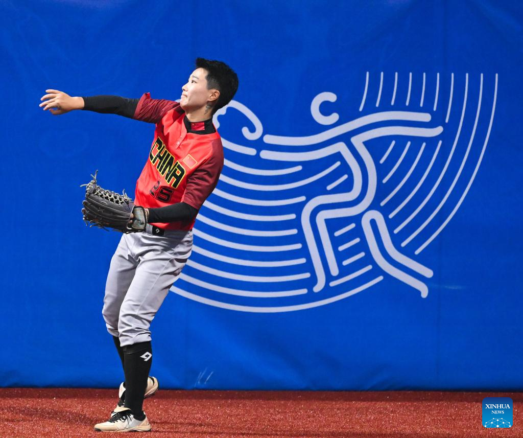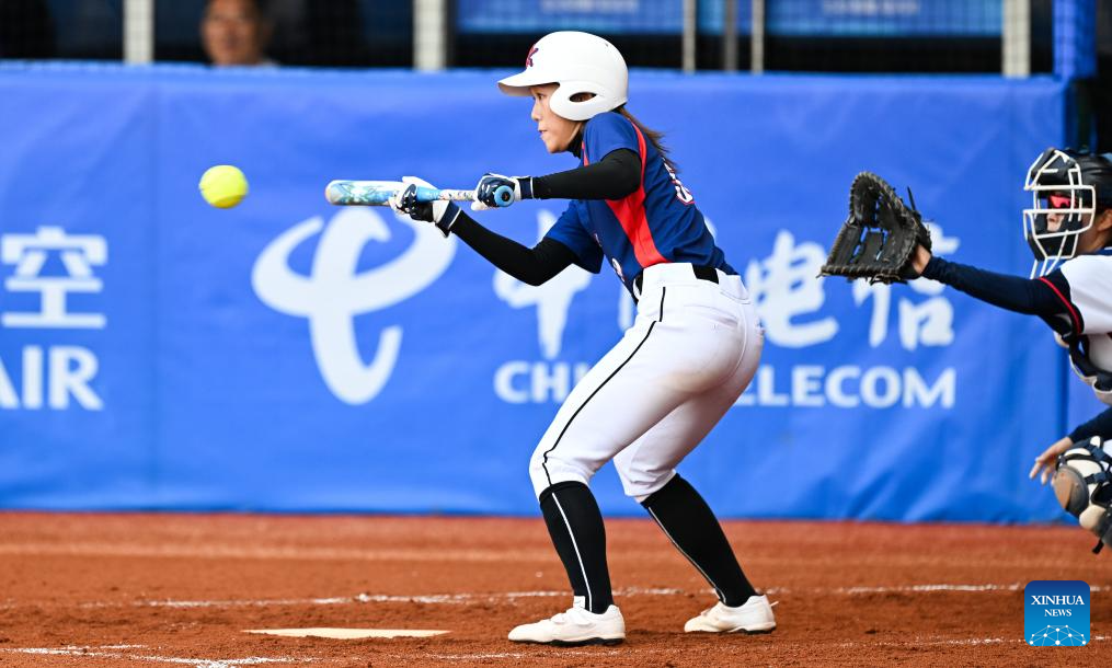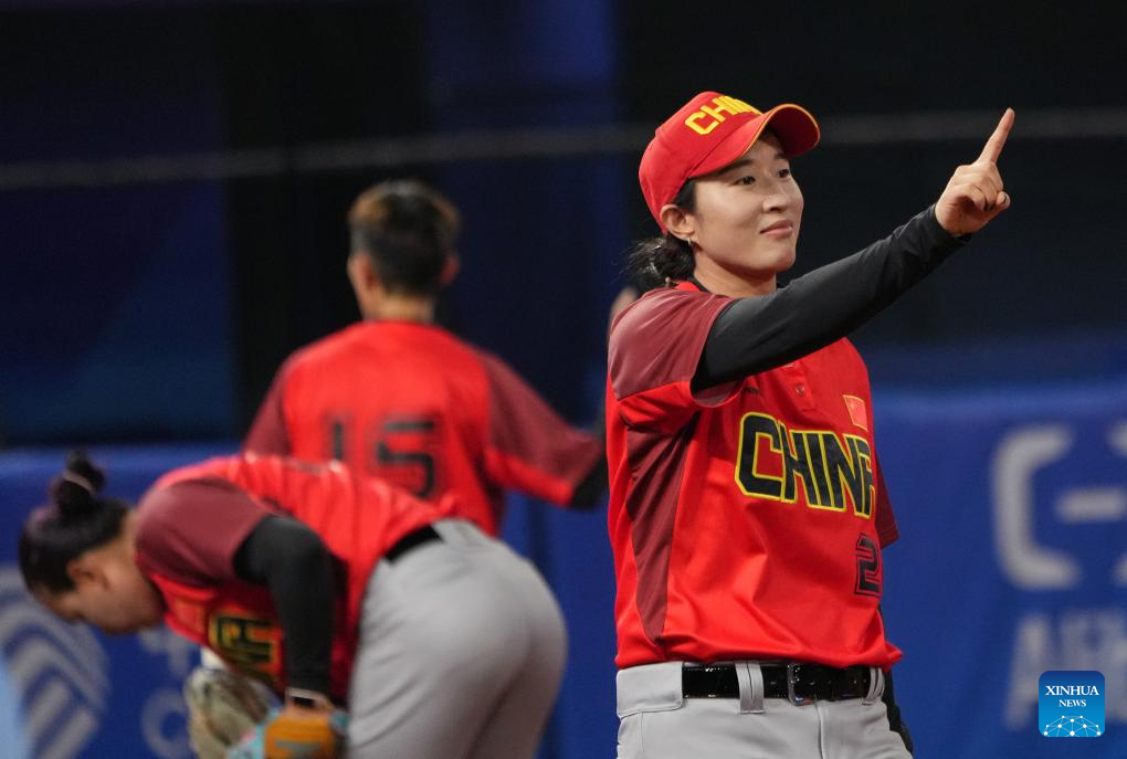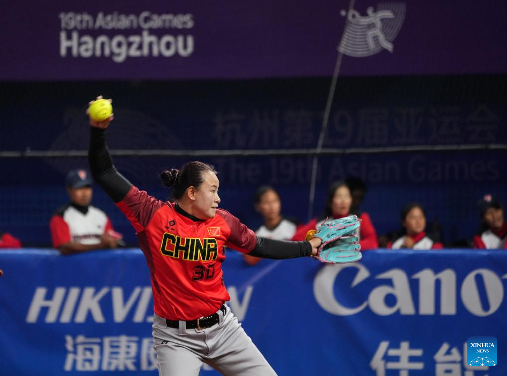Xi Kailin of China competes during Super Round 2 of Softball Women between China and Chinese Taipei at the 19th Asian Games in Shaoxing, east China's Zhejiang Province, Sept. 29, 2023. (Xinhua/Yang Guanyu)