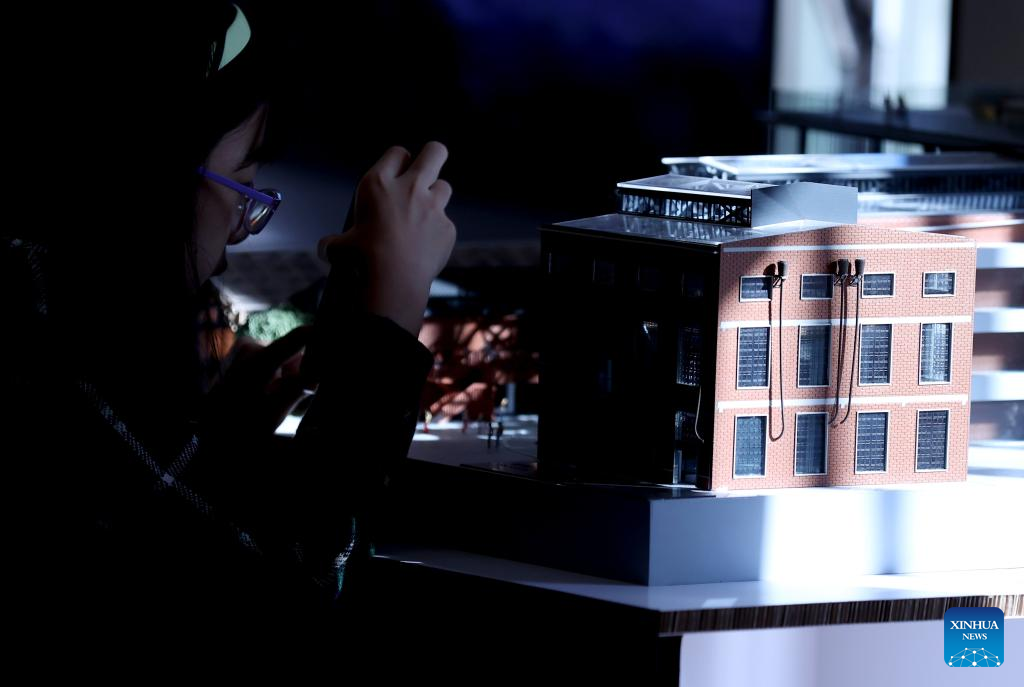 A visitor takes photos at the "Building Contemporary China" architecture exhibition in London, Britain, Sept. 29, 2023. From city museum to rural teahouse, an architecture exhibition showcasing diverse projects designed by Chinese architects kicked off here on Friday.(Xinhua/Li Ying)