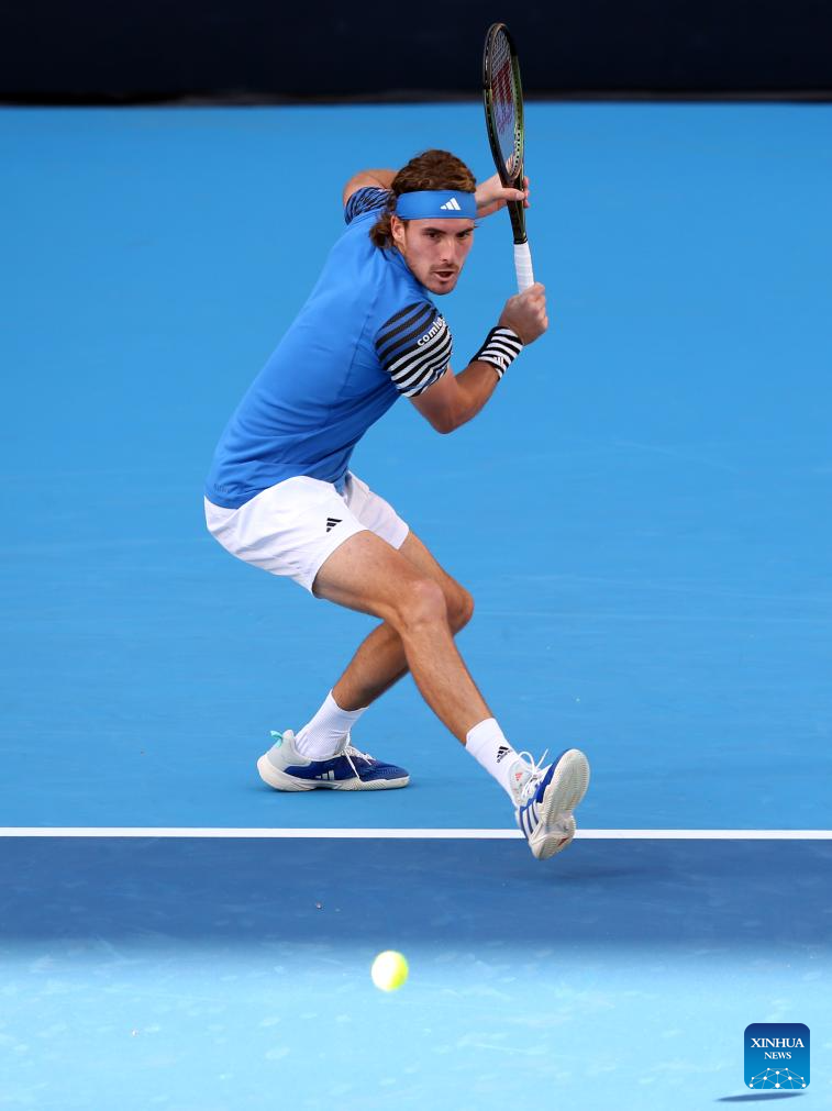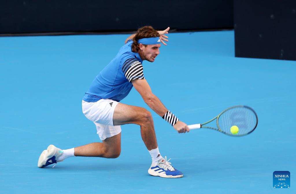 Greece's Stefanos Tsitsipas hits a return to Chile's Nicolas Jarry during the men's singles first round match at 2023 China Open tennis tournament in Beijing, capital of China, Sept. 29, 2023. (Xinhua/Luo Yuan)
