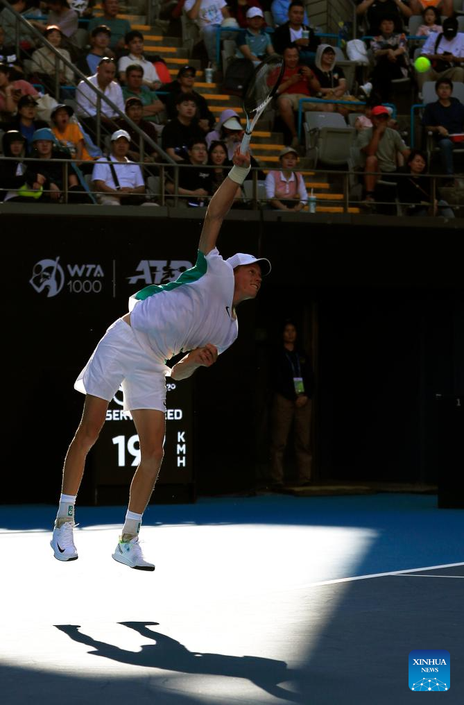Italy's Jannik Sinner serves to Britain's Daniel Evans during the men's singles first round match at 2023 China Open tennis tournament in Beijing, capital of China, Sept. 29, 2023. (Xinhua/Luo Yuan)