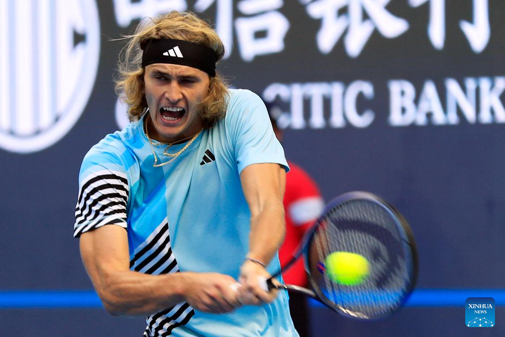 Germany's Alexander Zverev hits a return to Argentina's Diego Schwartzman during the men's singles first round match at 2023 China Open tennis tournament in Beijing, capital of China, Sept. 29, 2023. (Xinhua/Luo Yuan)