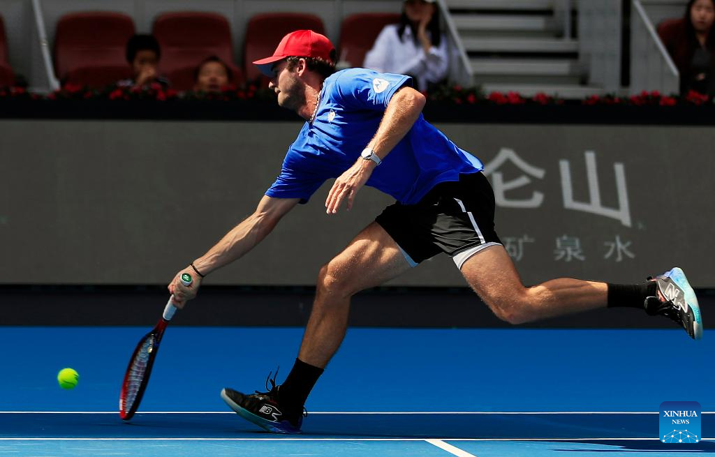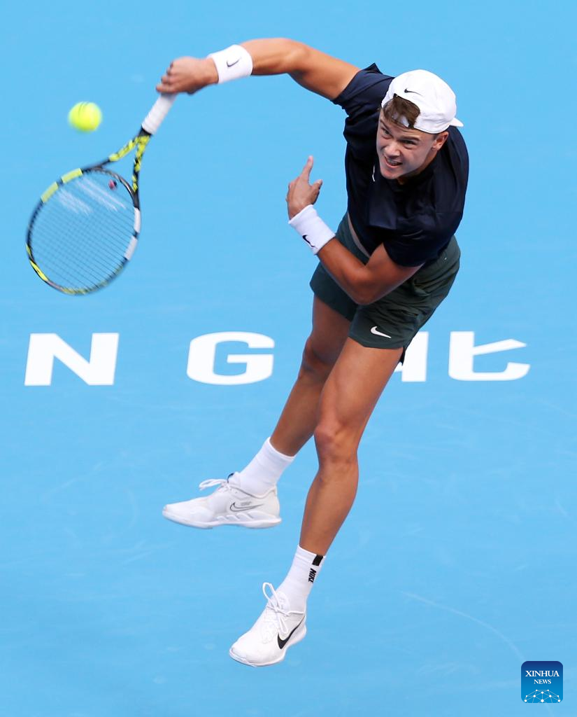 Tommy Paul of the United States hits a return to Daniil Medvedev during the men's singles first round match at 2023 China Open tennis tournament in Beijing, capital of China, Sept. 29, 2023. (Xinhua/Luo Yuan)