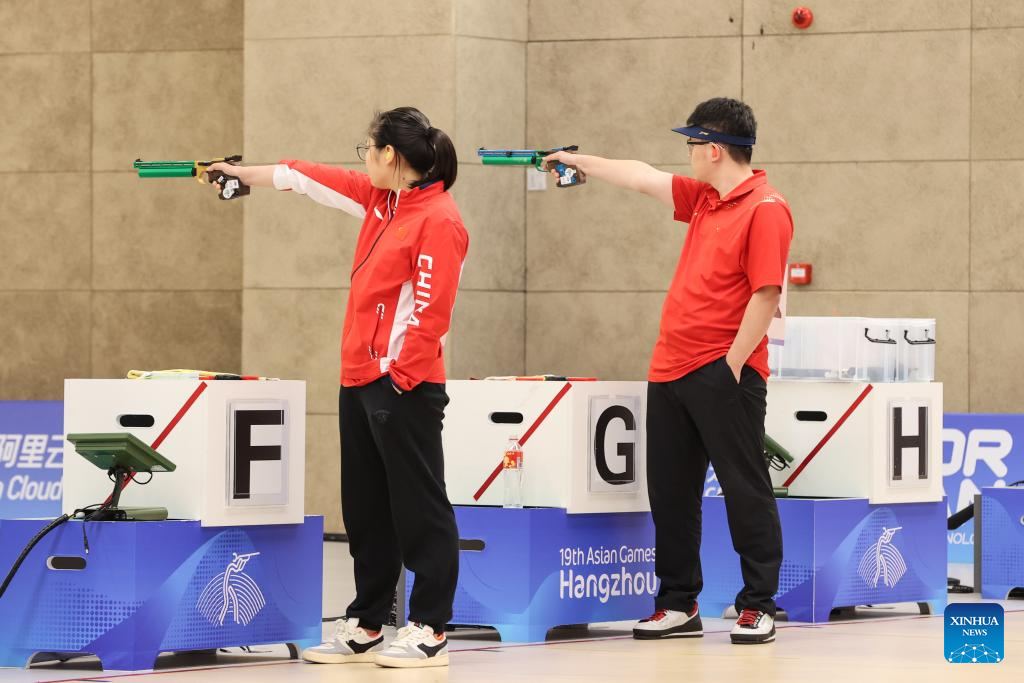HANGZHOU, Sept. 30 (Xinhua) -- China's Jiang Ranxin and Zhang Bowen edged their Indian rivals in the 10m air pistol mixed team event of the Hangzhou Asian Games to win the gold on Saturday.