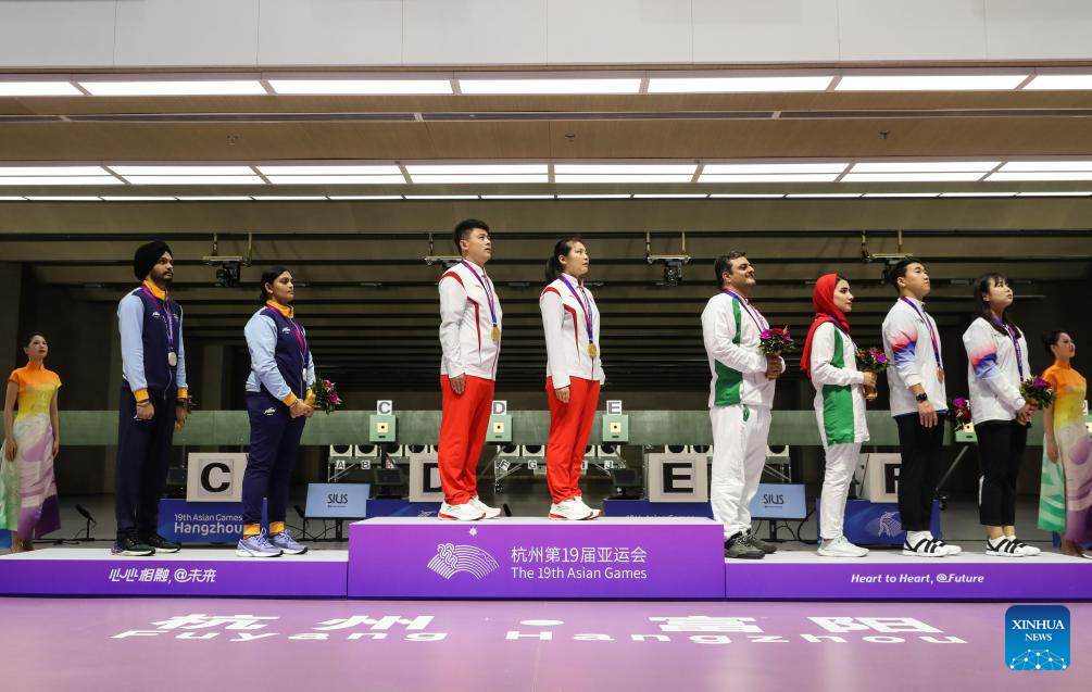Gold medalists team China (C), silver medalists team India (L) , bronze medalists team Iran and South Korea attend the awarding ceremony for the 10m Air Pistol Mixed Team of Shooting at the 19th Asian Games in Hangzhou, east China's Zhejiang Province, Sept. 30, 2023. (Xinhua/Shan Yuqi)
