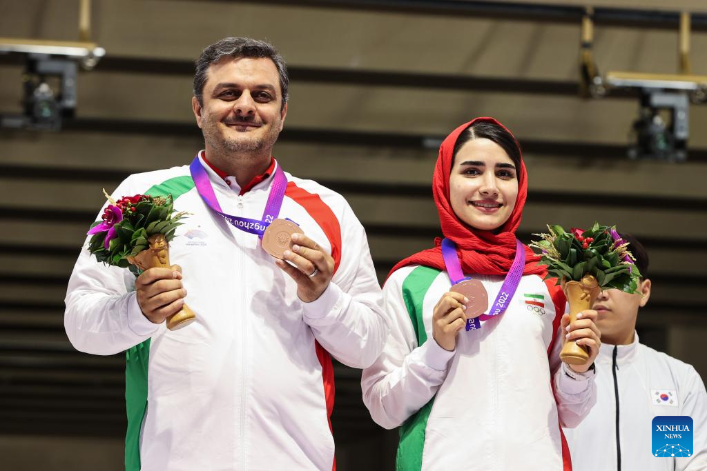Bronze medalists Amir Joharikhou (L)/Haniyeh Rostamiyan of Iran pose for photos during the awarding ceremony for the 10m Air Pistol Mixed Team of Shooting at the 19th Asian Games in Hangzhou, east China's Zhejiang Province, Sept. 30, 2023. (Xinhua/Shan Yuqi)
