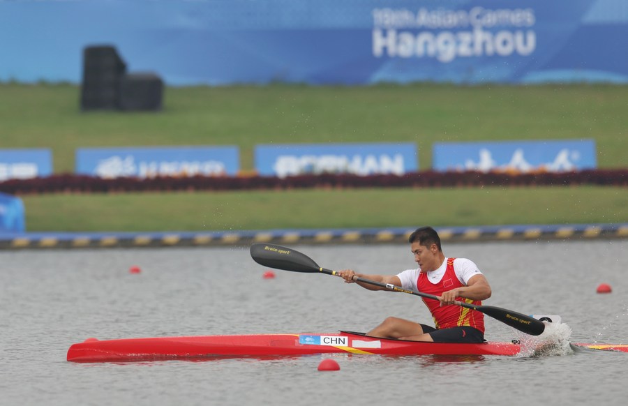 Zhang Dong in action during the men's kayak single 1000m heat, Sept. 30, 2023. (Xinhua/Du Xiaoyi)