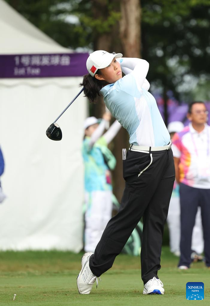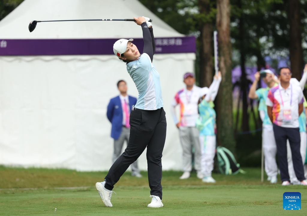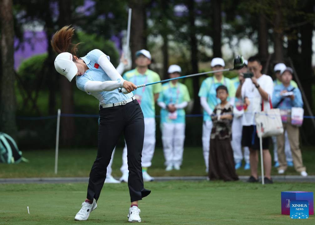 Lin Xiyu of China competes during the Women's Team Round 3 of Golf at the 19th Asian Games in Hangzhou, east China's Zhejiang Province, Sept. 30, 2023. (Xinhua/Cheng Tingting)