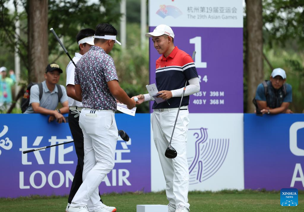 Chen Guxin (R) of China communicates with Hung Chien-Yao of Chinese Taipei and Atiruj Winaicharoenchai of Thailand before the Men's Individual Round 3 of Golf at the 19th Asian Games in Hangzhou, east China's Zhejiang Province, Sept. 30, 2023. (Xinhua/Cheng Tingting)