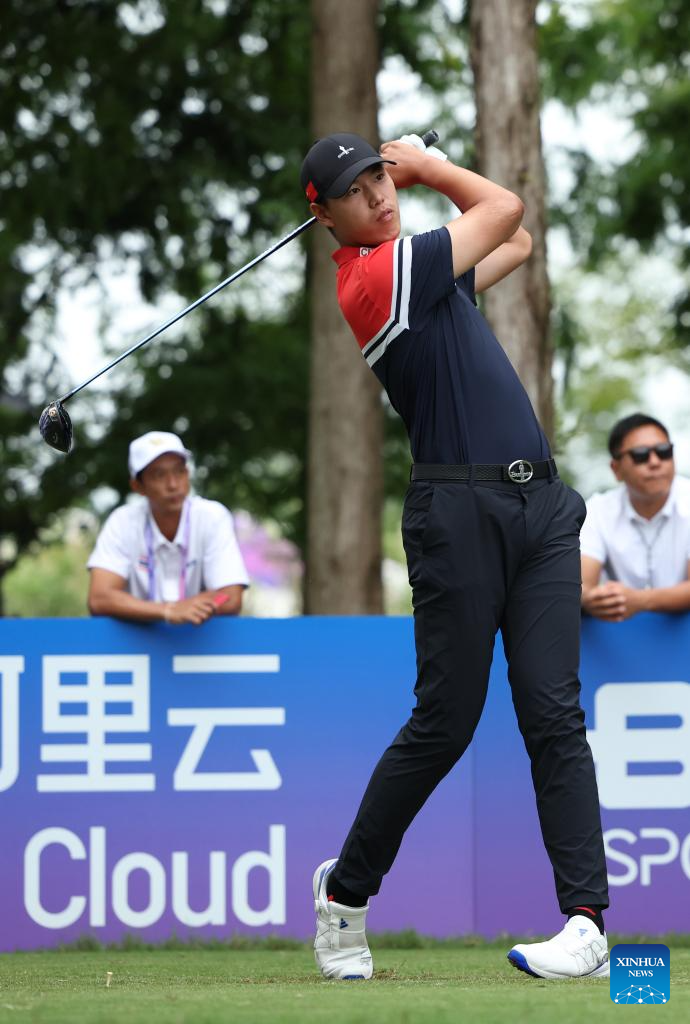 Ding Wenyi of China competes during the Men's Individual Round 3 of Golf at the 19th Asian Games in Hangzhou, east China's Zhejiang Province, Sept. 30, 2023. (Xinhua/Cheng Tingting)