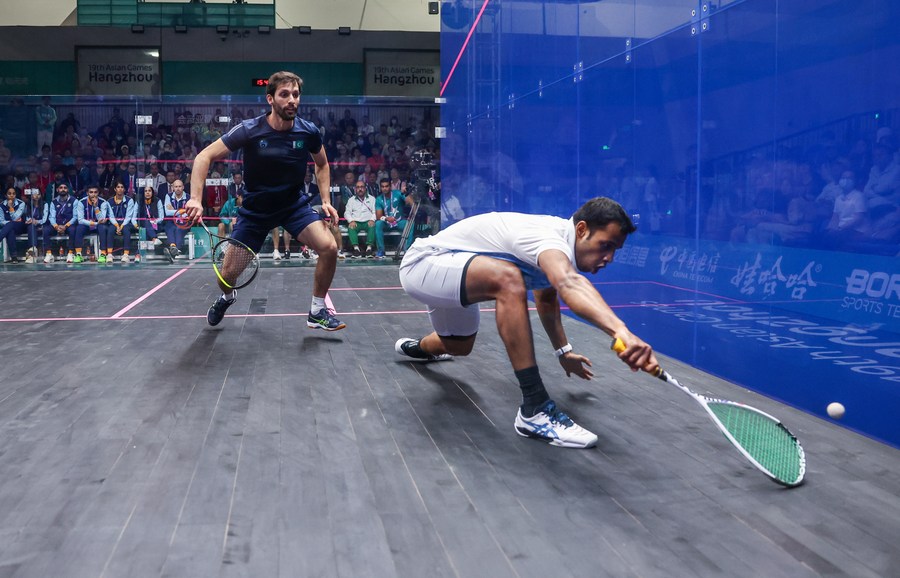 Nasir Iqbal (L) competes against Mahesh Mangaonkar during the men's team final at the Hangzhou Asian Games, Sept. 30, 2023. (Xinhua/Xu Yu)