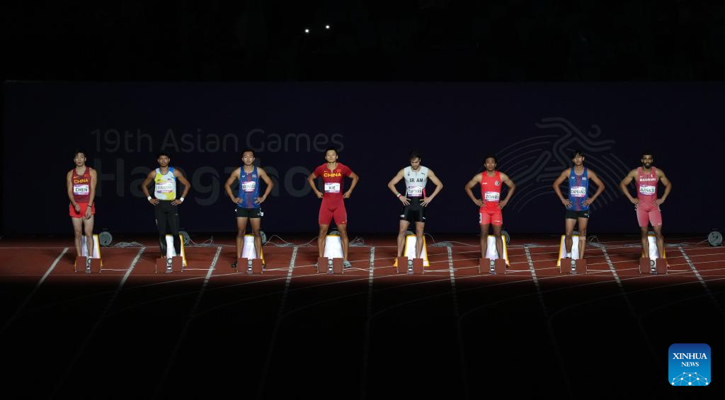 Xie Zhenye (4th L) of China reacts before the Men's 100m Final of Athletics at the 19th Asian Games in Hangzhou, east China's Zhejiang Province, Sept. 30, 2023. (Xinhua/Jiang Wenyao)