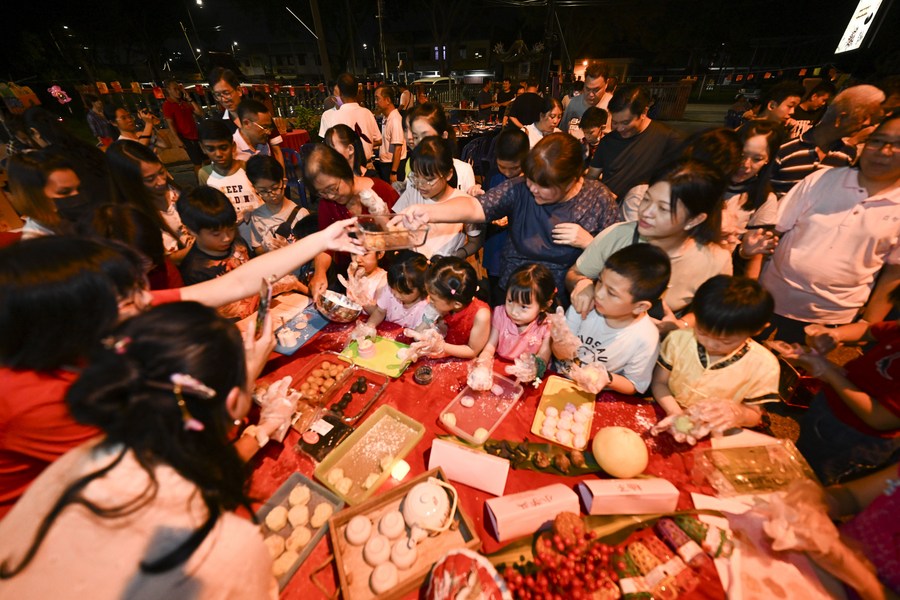 People take part in a mooncake making activity during a mid-autumn festival gala in Malacca, Malaysia, Sept. 27, 2023. (Xinhua/Cheng Yiheng)