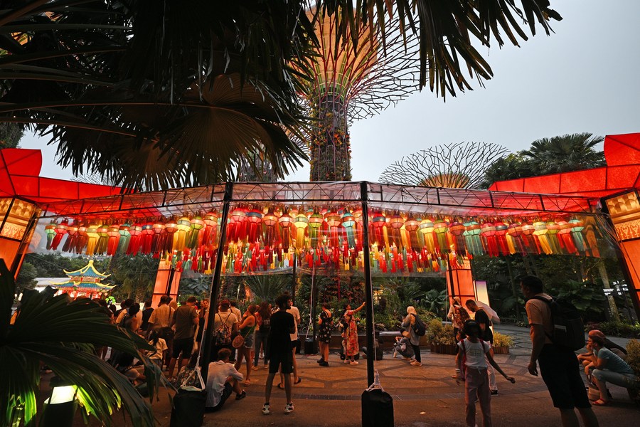 Gardens by the Bay, an iconic spot of the city-state, is open for Mid-Autumn Festival lantern displays that combine traditional Chinese architectural patterns like moon gate and pavilion with Chinese myths, the Butterfly Lovers and the Moon Rabbit, to convey Mid-Autumn themes of reunion, family affection and harmony.