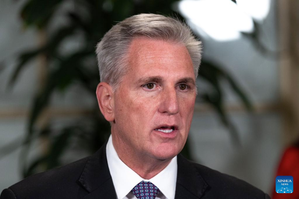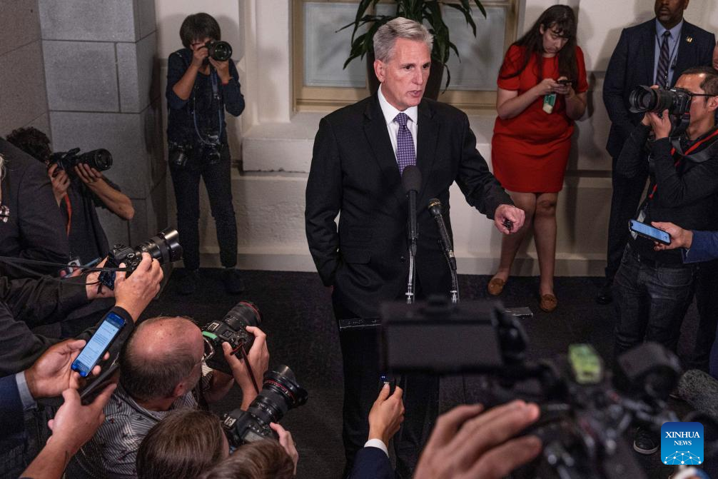 U.S. House Speaker Kevin McCarthy speaks to members of the media in the U.S. Capitol in Washington, D.C., the United States, Sept. 29, 2023. The Republican-led House of Representatives failed to approve a one-month stopgap funding bill on Friday, as a U.S. federal government shutdown after Saturday midnight appears increasingly inevitable.