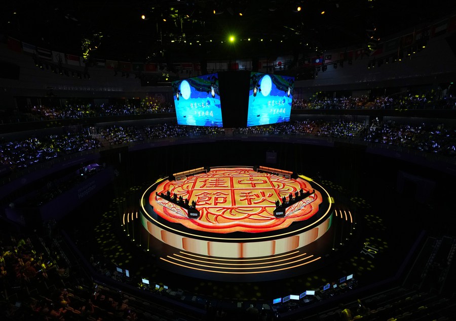 A Mid-Autumn Festival themed light show is performed at the venue of the League of Legends Final Match of Esports at the 19th Asian Games in Hangzhou, east China's Zhejiang Province, Sept. 29, 2023 (Xinhua/Han Chuanhao)