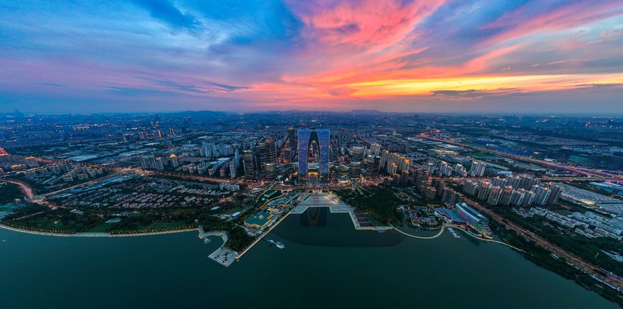 This aerial panorama photo taken on July 3, 2023 shows the night view of an industrial park in Suzhou, east China's Jiangsu Province. (Xinhua/Li Bo)