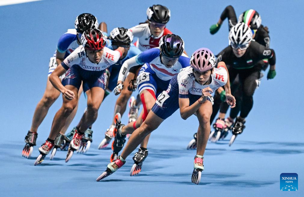 Liu Yi-Hsuan (front) of Chinese Taipei competes after the Women's Speed Skating 1000m Sprint Tournament Final of Roller Skating at the 19th Asian Games in Hangzhou, east China's Zhejiang Province, Oct. 1, 2023. (Xinhua/Chen Yehua)