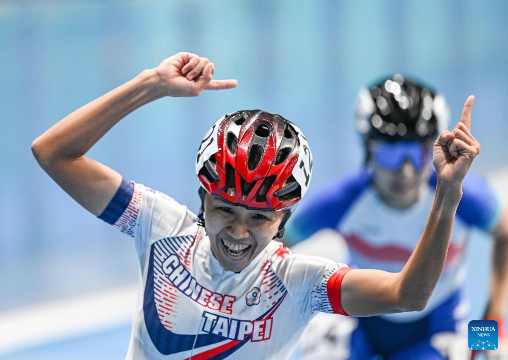 Li Meng-Chu of Chinese Taipei celebrates after the Women's Speed Skating 1000m Sprint Tournament Final of Roller Skating at the 19th Asian Games in Hangzhou, east China's Zhejiang Province, Oct. 1, 2023. (Xinhua/Chen Yehua)