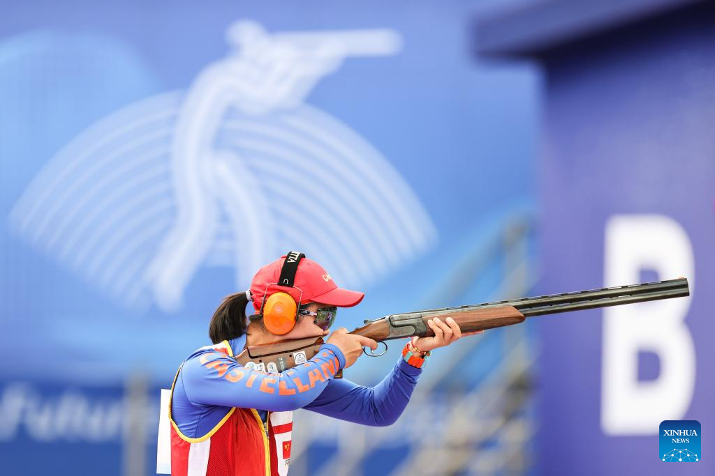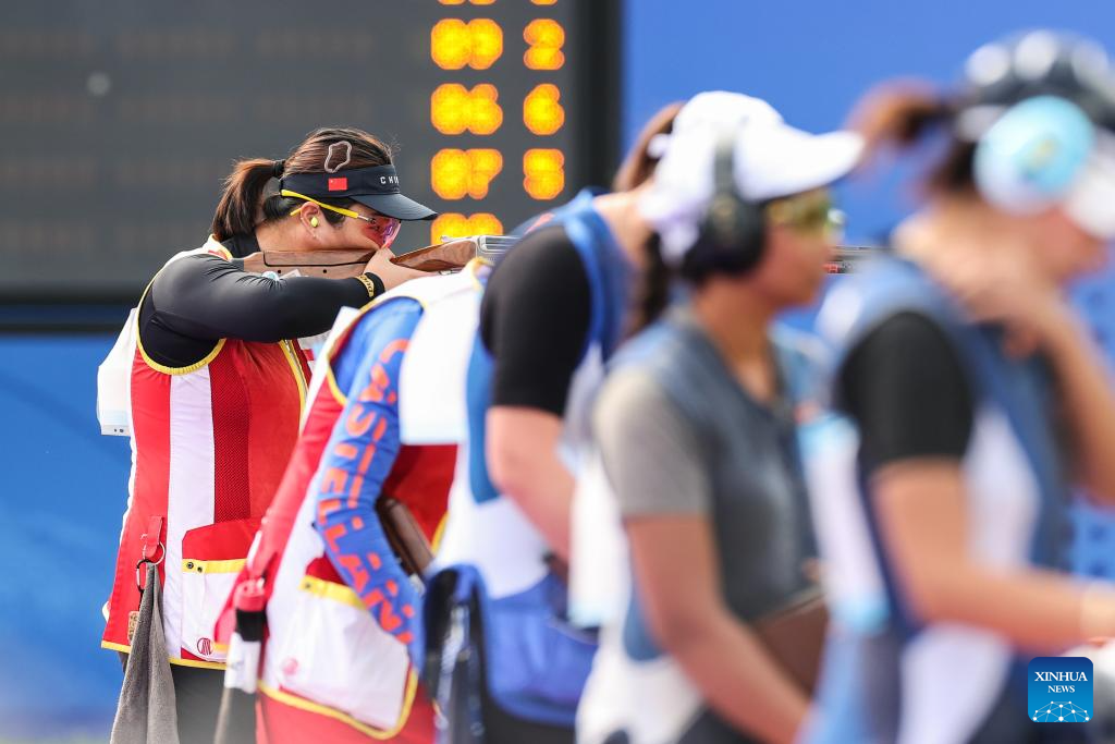 Wu Cuicui (1st, L) of China competes during the Trap Women's Final of Shooting at the 19th Asian Games in Hangzhou, east China's Zhejiang Province, Oct. 1, 2023. (Xinhua/Shan Yuqi)