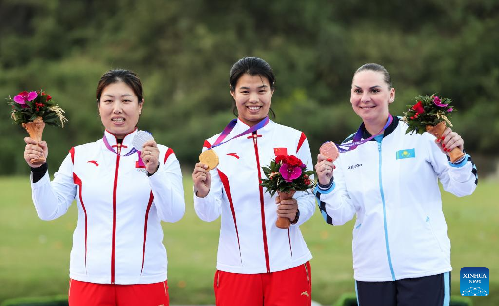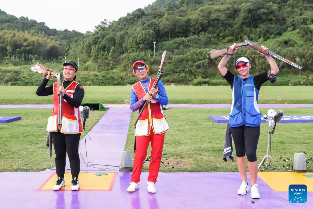 Gold medalist Zhang Xinqiu (C)of China, silver medalist Wu Cuicui (L)of China and bronze medalist Mariya Dmitriyenko of Kazakhstan attend the awarding ceremony for the Trap Women's Final of Shooting at the 19th Asian Games in Hangzhou, east China's Zhejiang Province, Oct. 1, 2023. (Xinhua/Shan Yuqi)