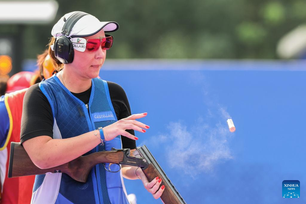 Mariya Dmitriyenko of Kazakhstan reacts during the Trap Women's Final of Shooting at the 19th Asian Games in Hangzhou, east China's Zhejiang Province, Oct. 1, 2023. (Xinhua/Shan Yuqi)