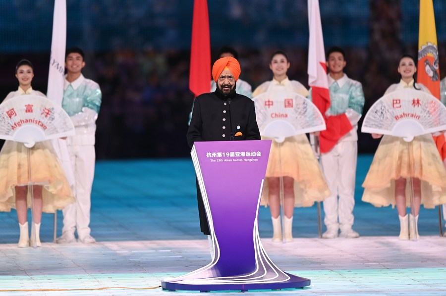 Raja Randhir Singh, acting president of the Olympic Council of Asia (OCA), addresses the opening ceremony of the Hangzhou Asian Games, Sept. 23, 2023. (Xinhua/Huang Zongzhi)