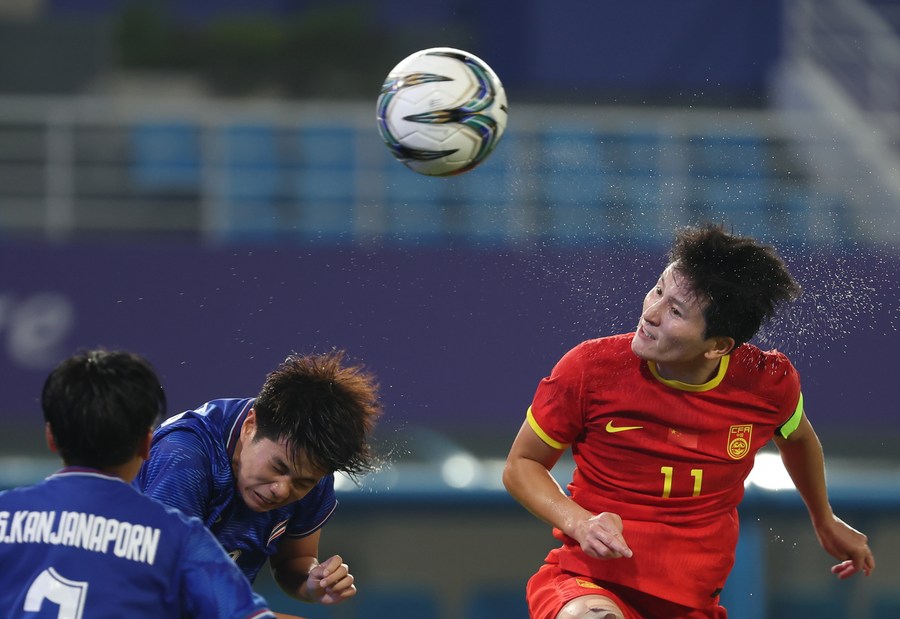 Wang Shanshan (R) of China scores a header during the football women's quarterfinal against Thailand at the Hangzhou Asian Games on Sept. 30, 2023. (Xinhua/Gong Bing)