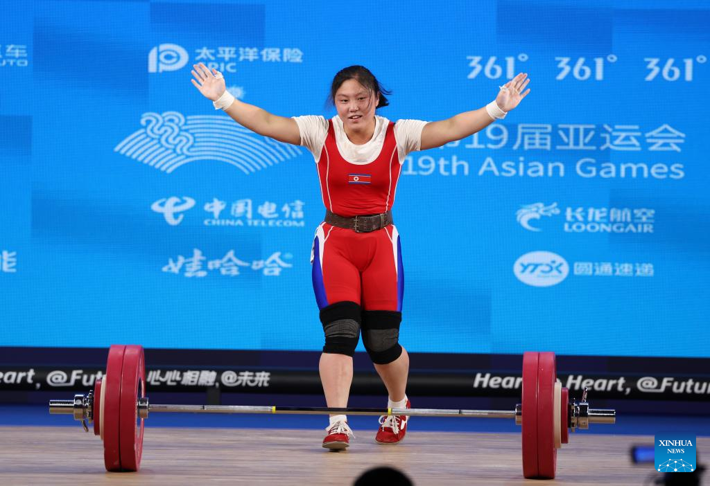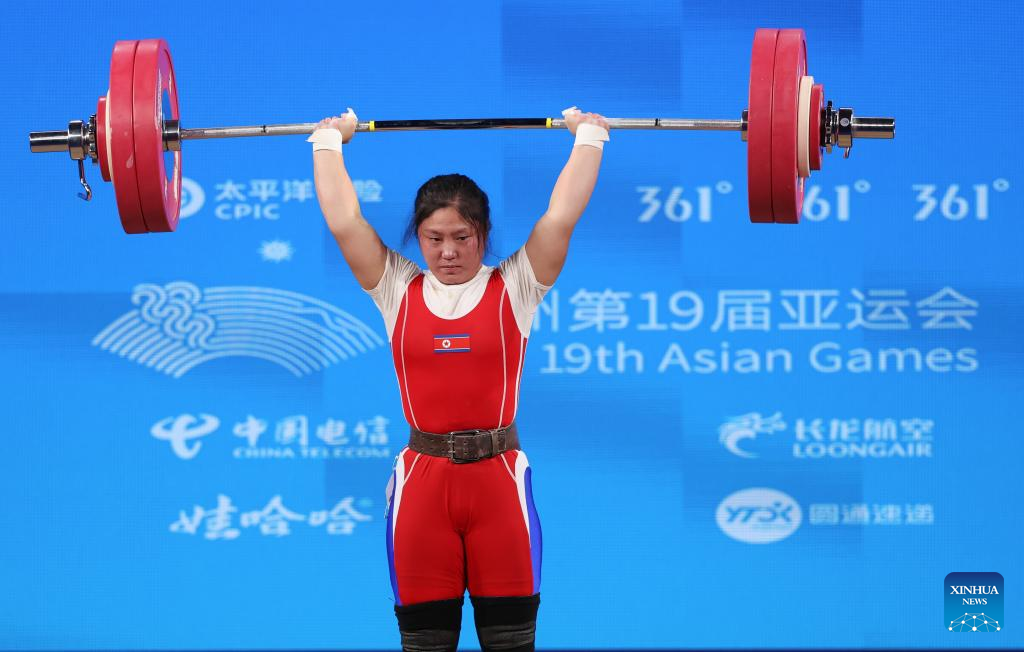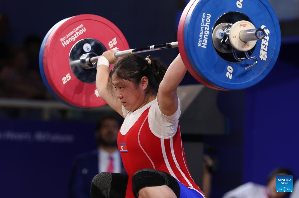 Kim Ilgyong of the Democratic People's Republic of Korea (DPRK) competes during the Women's 59Kg Group A match of Weightlifting at the 19th Asian Games in Hangzhou, east China's Zhejiang Province, Oct. 2, 2023. (Xinhua/Yang Lei)