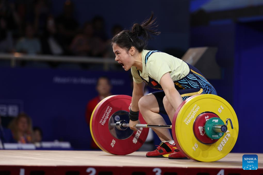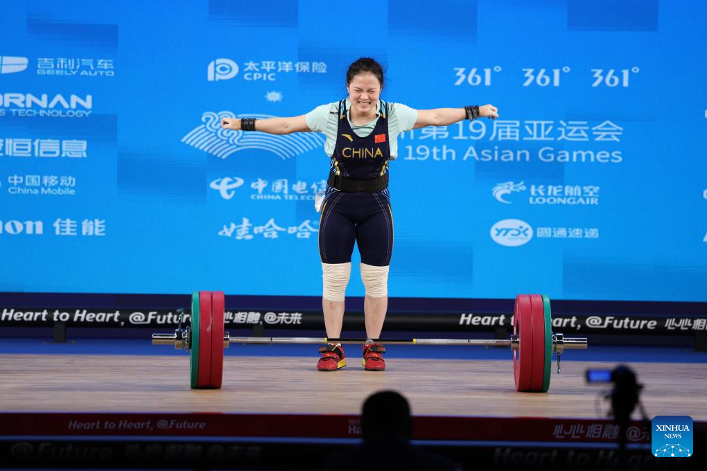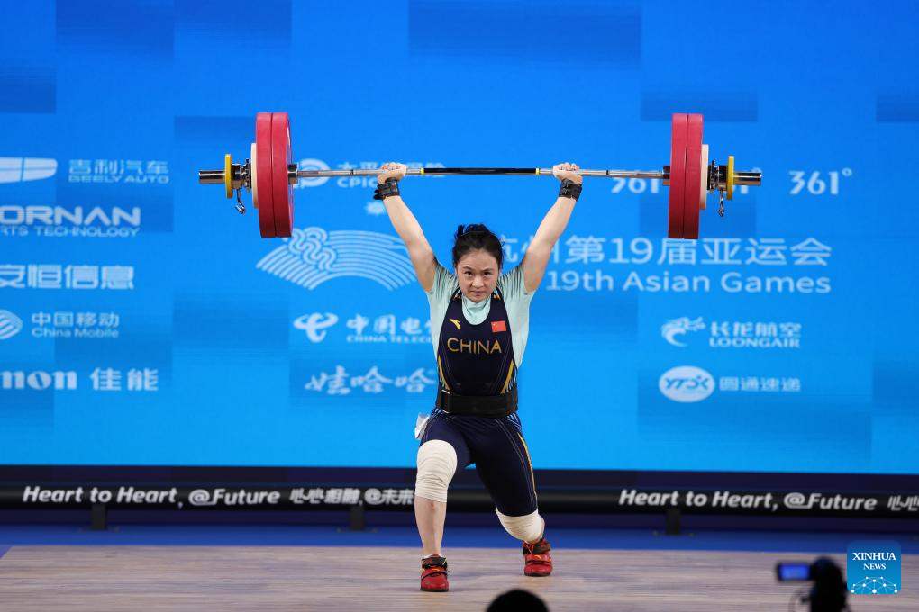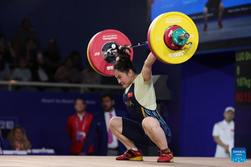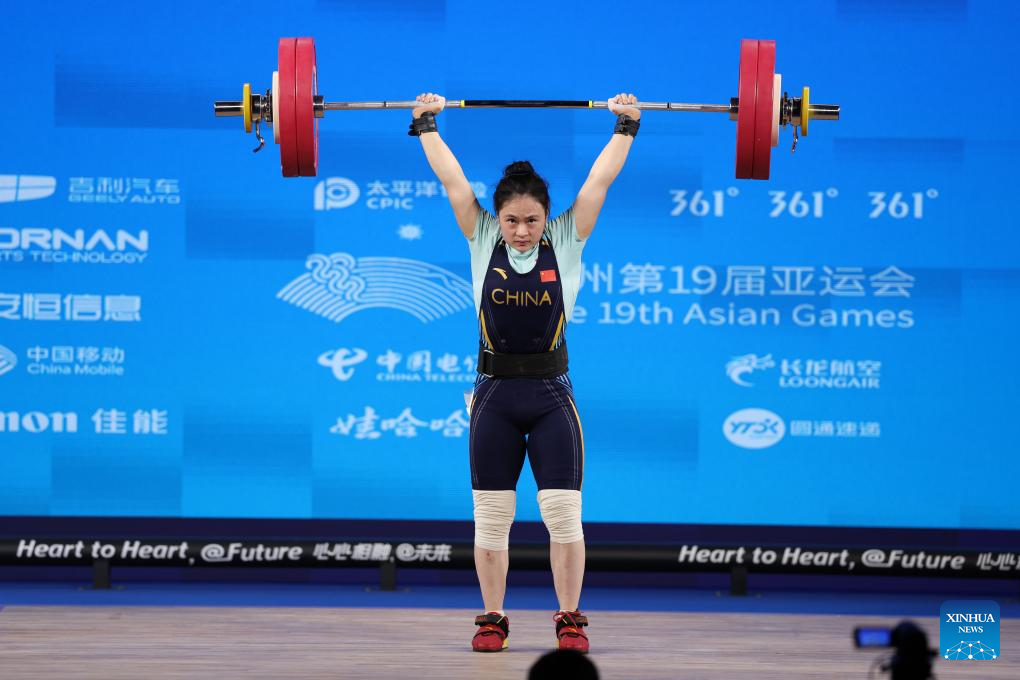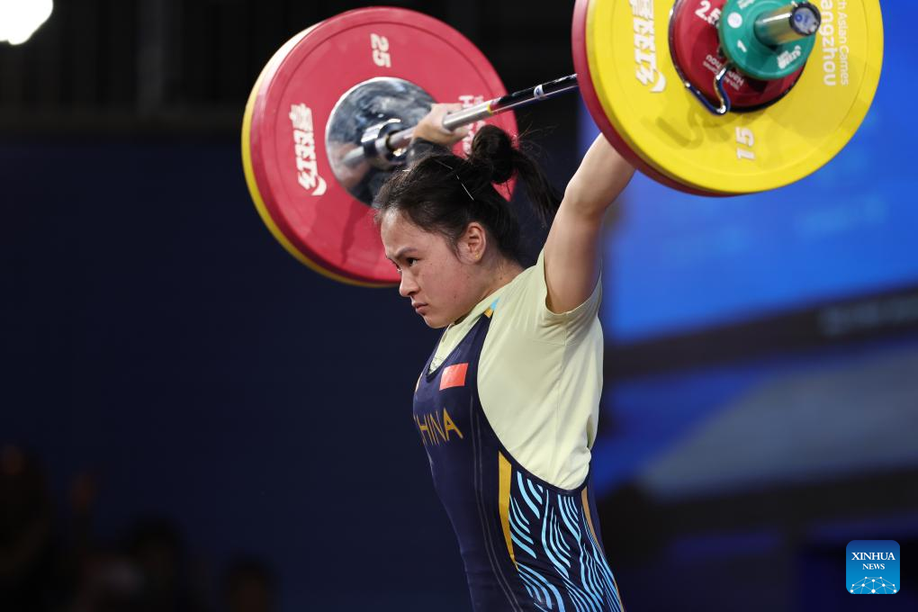 Luo Shifang of China competes during the Women's 59Kg Group A match of Weightlifting at the 19th Asian Games in Hangzhou, east China's Zhejiang Province, Oct. 2, 2023. (Xinhua/Yang Lei)