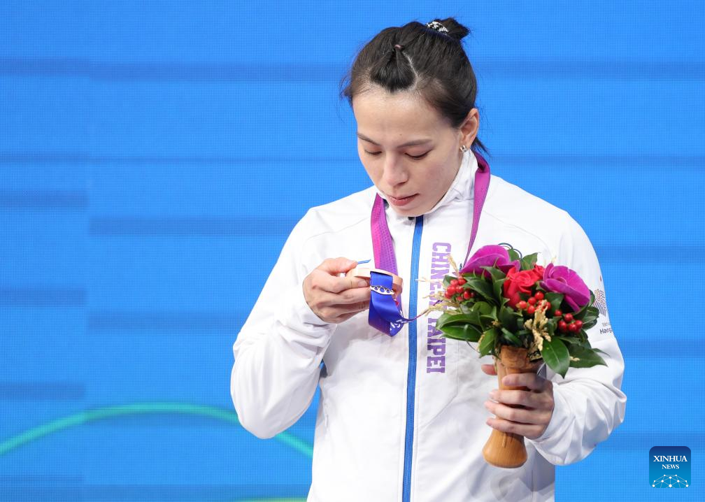 Kuo Hsing Chun of Chinese Taipei attends the awarding ceremony for the Women's 59Kg Group A match of Weightlifting at the 19th Asian Games in Hangzhou, east China's Zhejiang Province, Oct. 2, 2023. (Xinhua/Yang Lei)