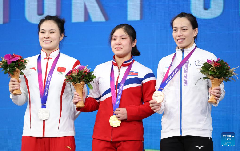 Gold medalist Kim Ilgyong (C) of the Democratic People's Republic of Korea (DPRK), silver medalist Luo Shifang (L) of China and bronze medalist Kuo Hsing Chun of Chinese Taipei attend the awarding ceremony for the Women's 59Kg Group A match of Weightlifting at the 19th Asian Games in Hangzhou, east China's Zhejiang Province, Oct. 2, 2023. (Xinhua/Yang Lei)