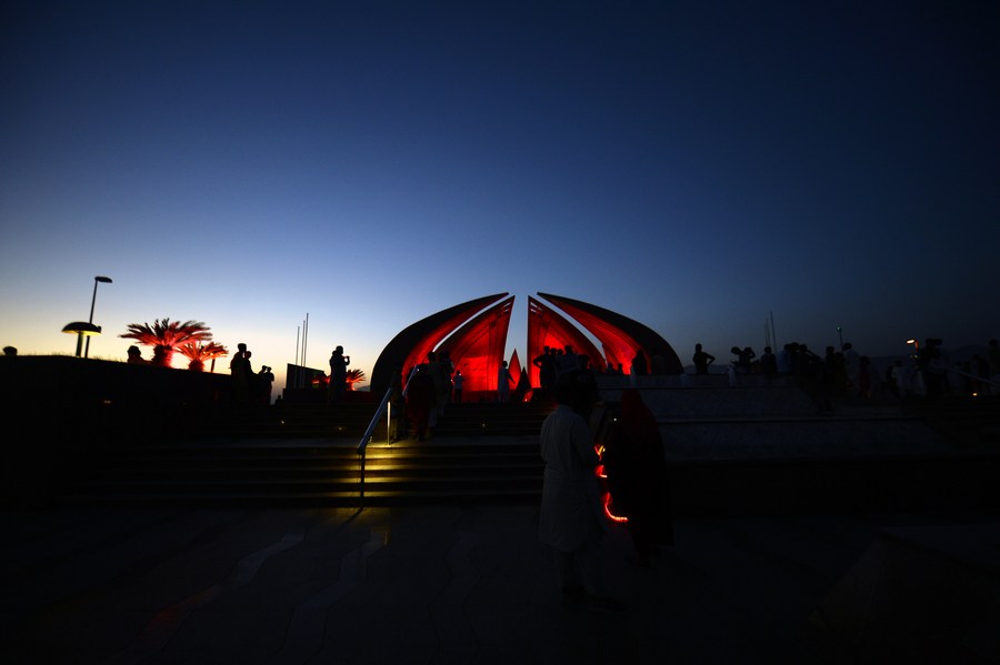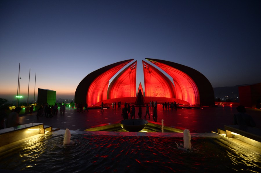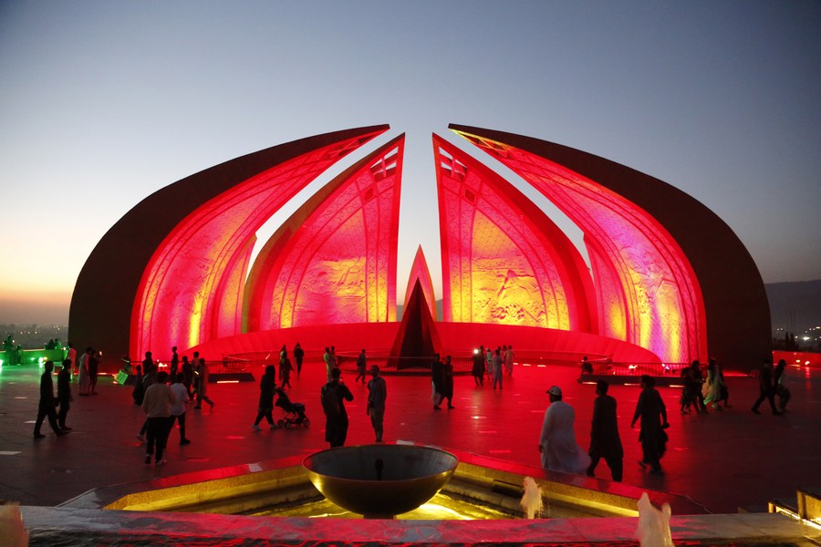 People visit the National Monument illuminated in red color to celebrate the 74th anniversary of the founding of the People's Republic of China, in Islamabad, capital of Pakistan on Oct. 1, 2023. (Xinhua/Ahmad Kamal)