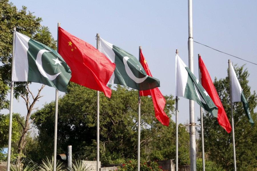 Chinese national flags and Pakistani national flags are raised to celebrate the 74th anniversary of the founding of the People's Republic of China, by an avenue in Islamabad, capital of Pakistan, on Oct. 1, 2023. (Xinhua/Ahmad Kamal)■