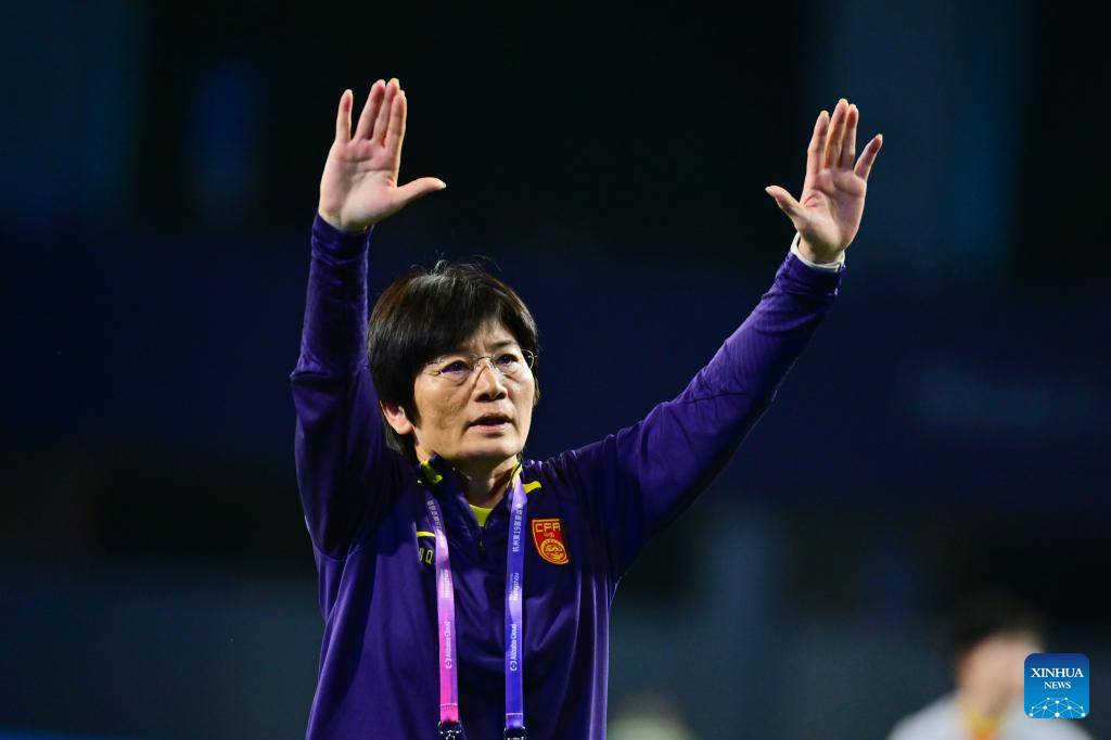Coach Shui Qingxia of team China reacts during the women's football semifinal between China and Japan at the 19th Asian Games in Hangzhou, east China's Zhejiang Province, Oct. 3, 2023. (Xinhua/Li Ga)