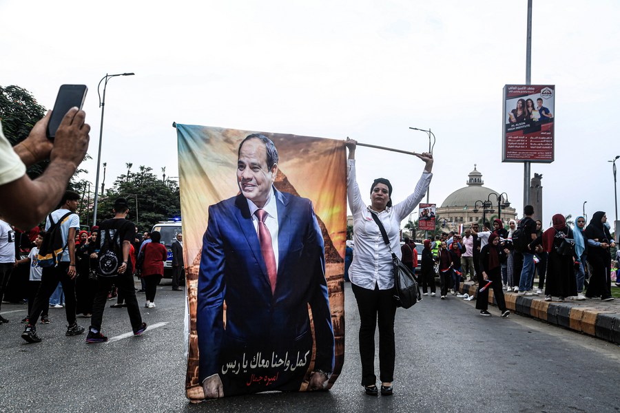 A supporter of Egyptian President Abdel-Fattah al-Sisi takes part in a rally in Cairo, Egypt, on Oct. 2, 2023. Sisi announced on Monday that he will run for the upcoming presidential election slated for December this year. (Xinhua/Ahmed Gomaa)