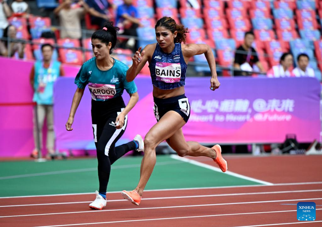 Harmilan Bains (R) of India competes during the Women's 800m Heat of Athletics at the 19th Asian Games in Hangzhou, east China's Zhejiang Province, Oct. 3, 2023. (Xinhua/Song Yanhua)